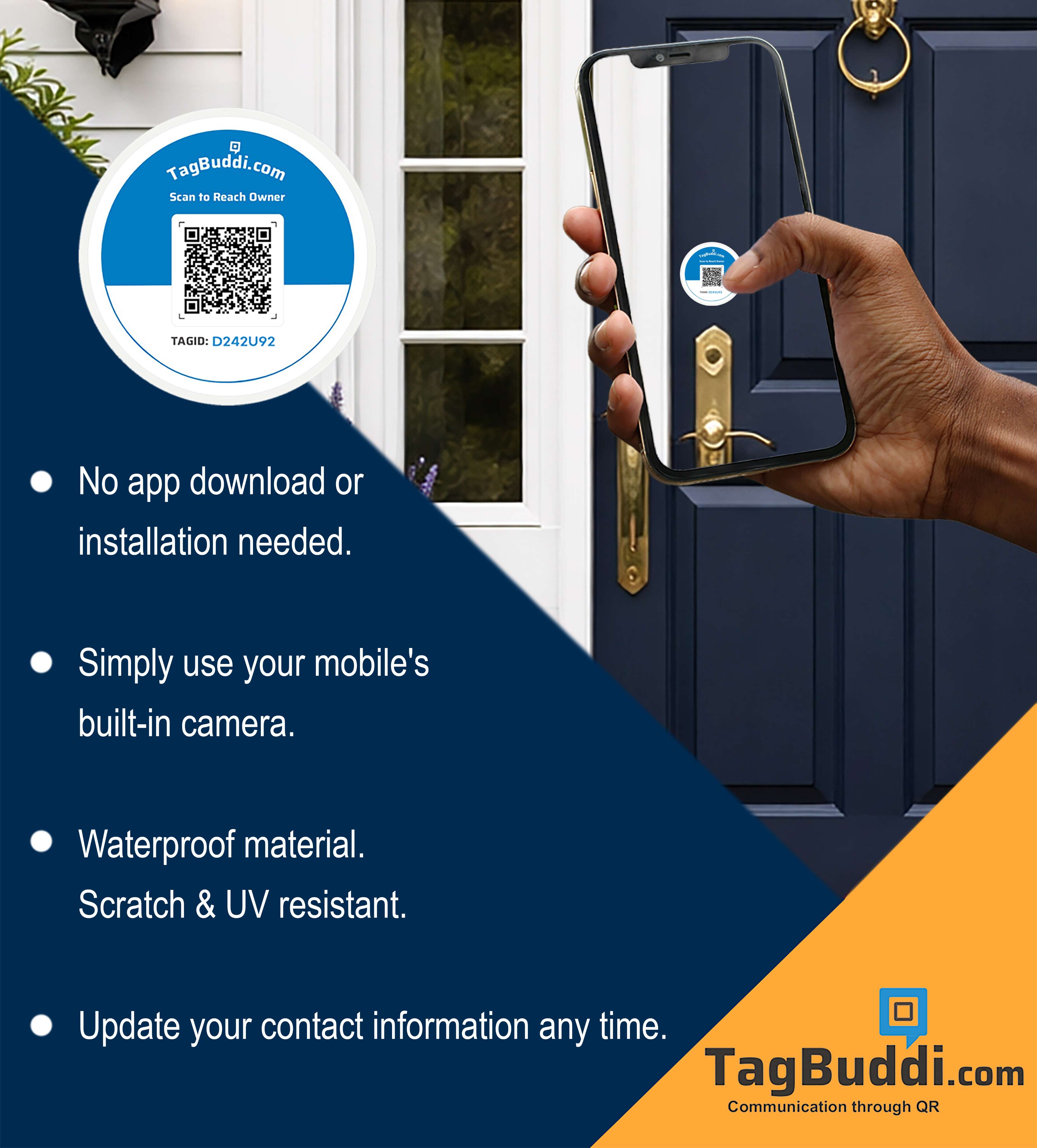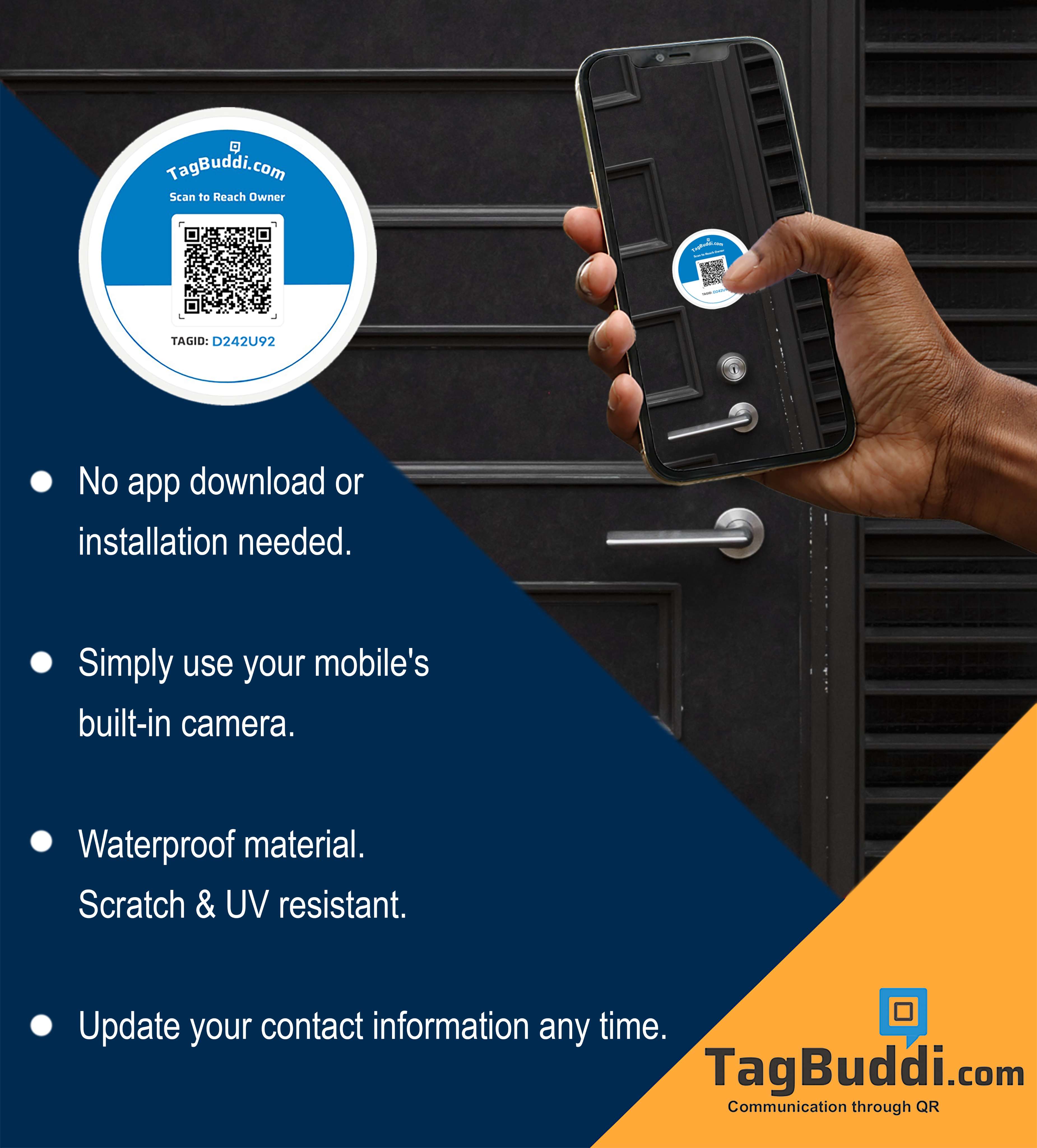 Place the TagBuddi QR sticker on your main door, apartment entrance, or gate. If someone needs to contact you — delivery agents, visitors, neighbours, or security staff — they can scan the QR and reach you instantly. Messages are allowed only after phone number verification via OTP, ensuring safe and secure communication.