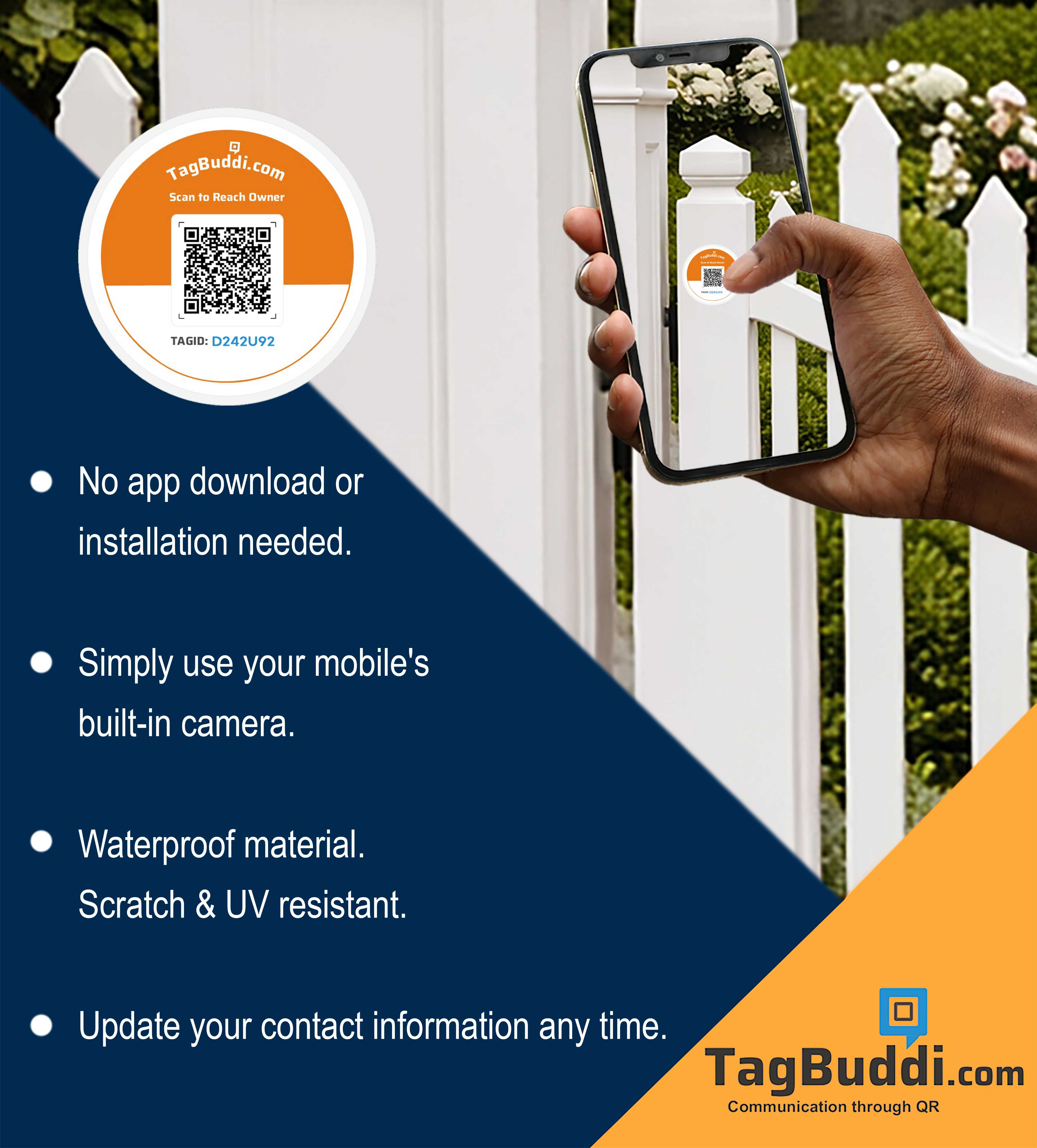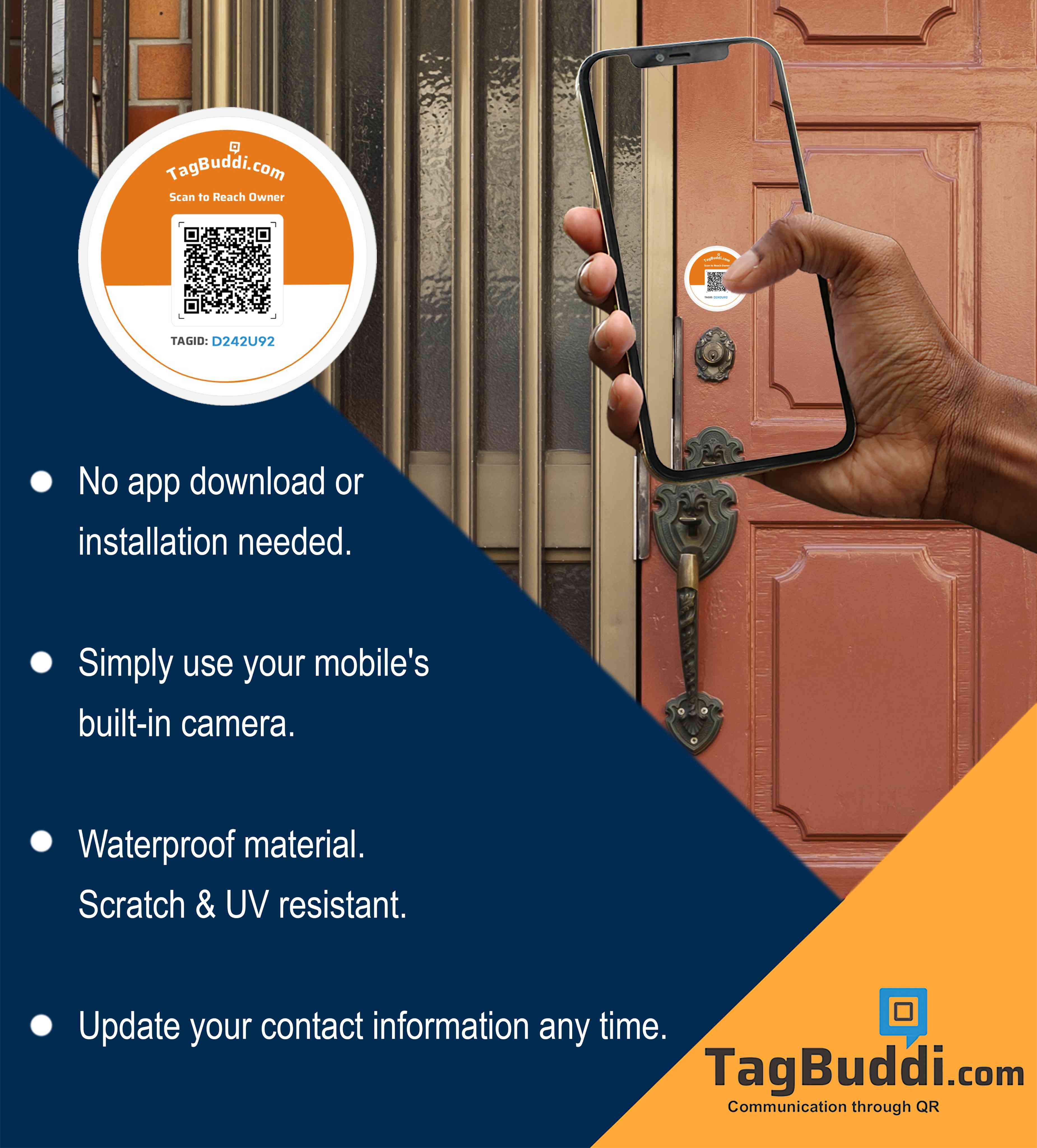 Place the TagBuddi QR sticker on your main door, apartment entrance, or gate. If someone needs to contact you — delivery agents, visitors, neighbours, or security staff — they can scan the QR and reach you instantly. Messages are allowed only after phone number verification via OTP, ensuring safe and secure communication.