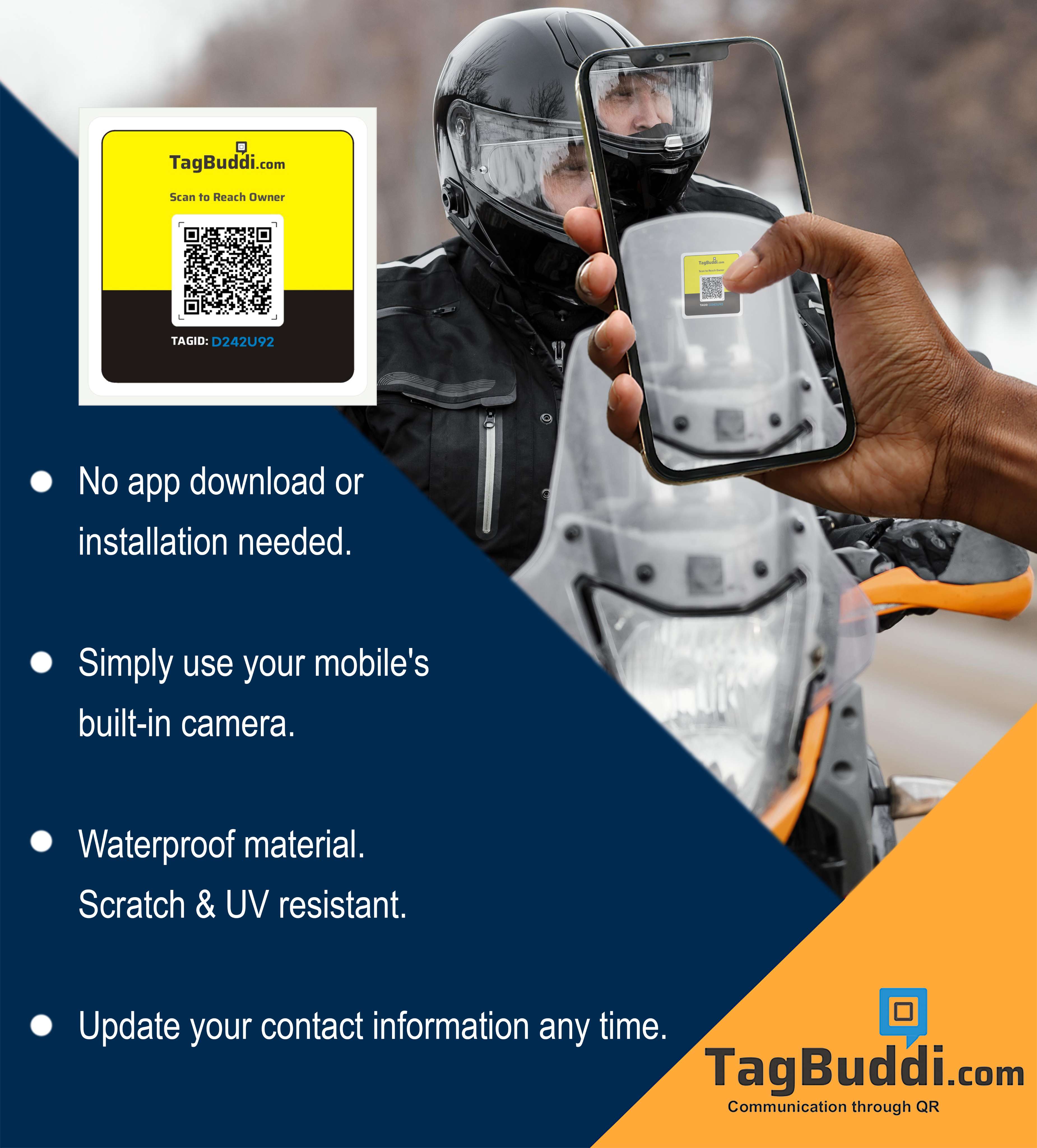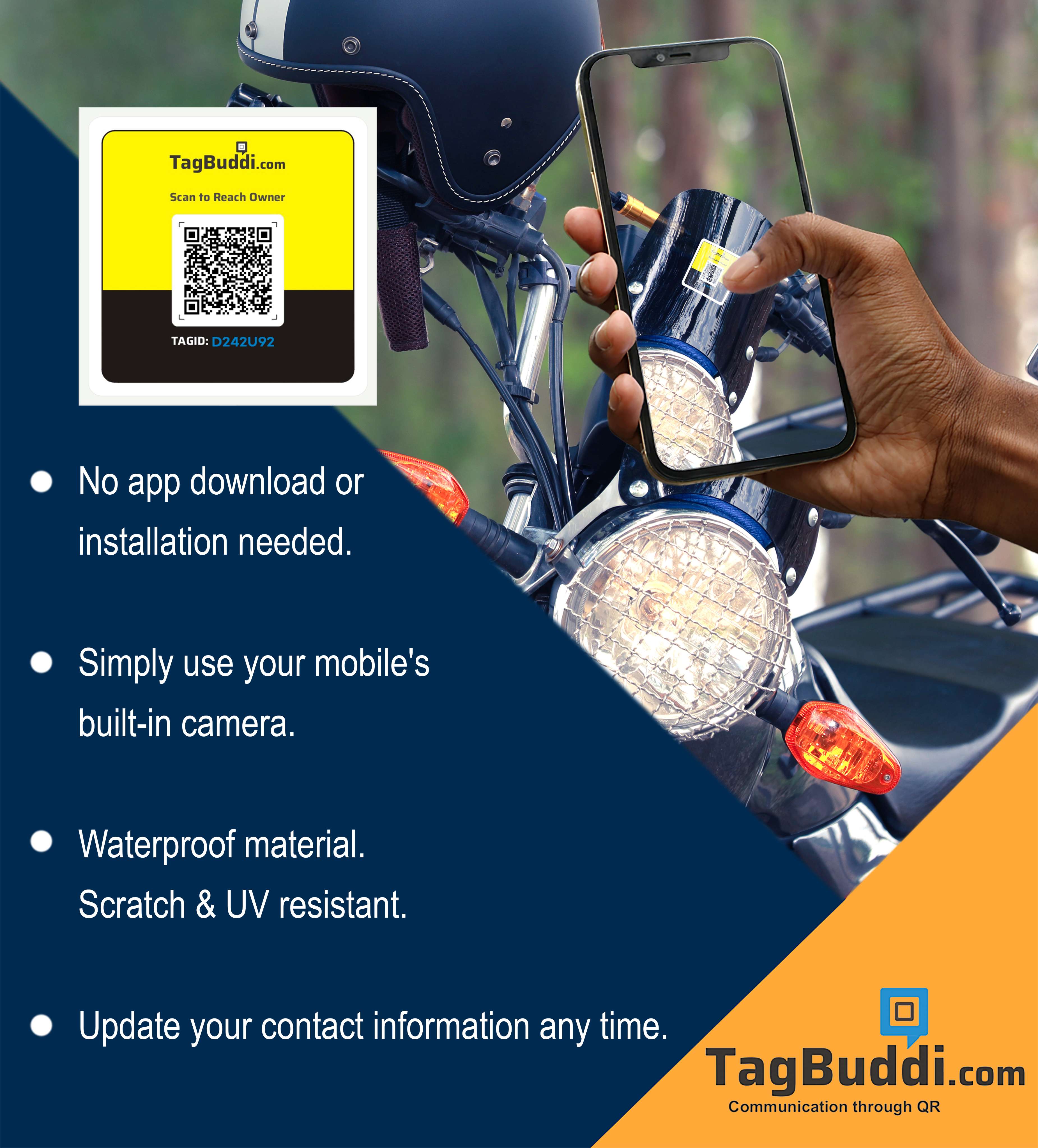 Attach the TagBuddi QR tag to your two-wheeler. If someone finds it parked wrongly, unattended, or at risk, they can scan the QR and reach you instantly. Finders can message you only after verifying their phone number via OTP — keeping communication safe and secure.