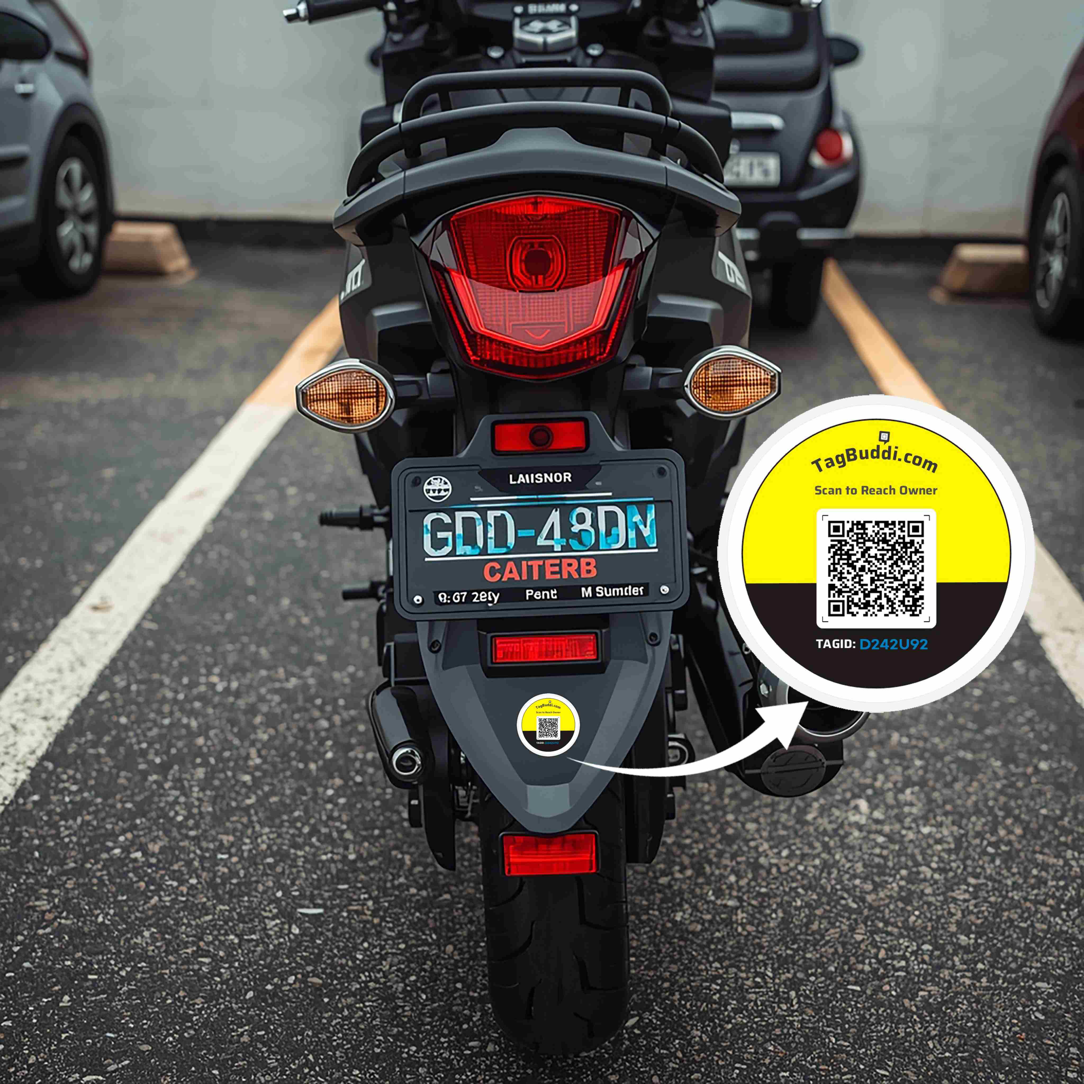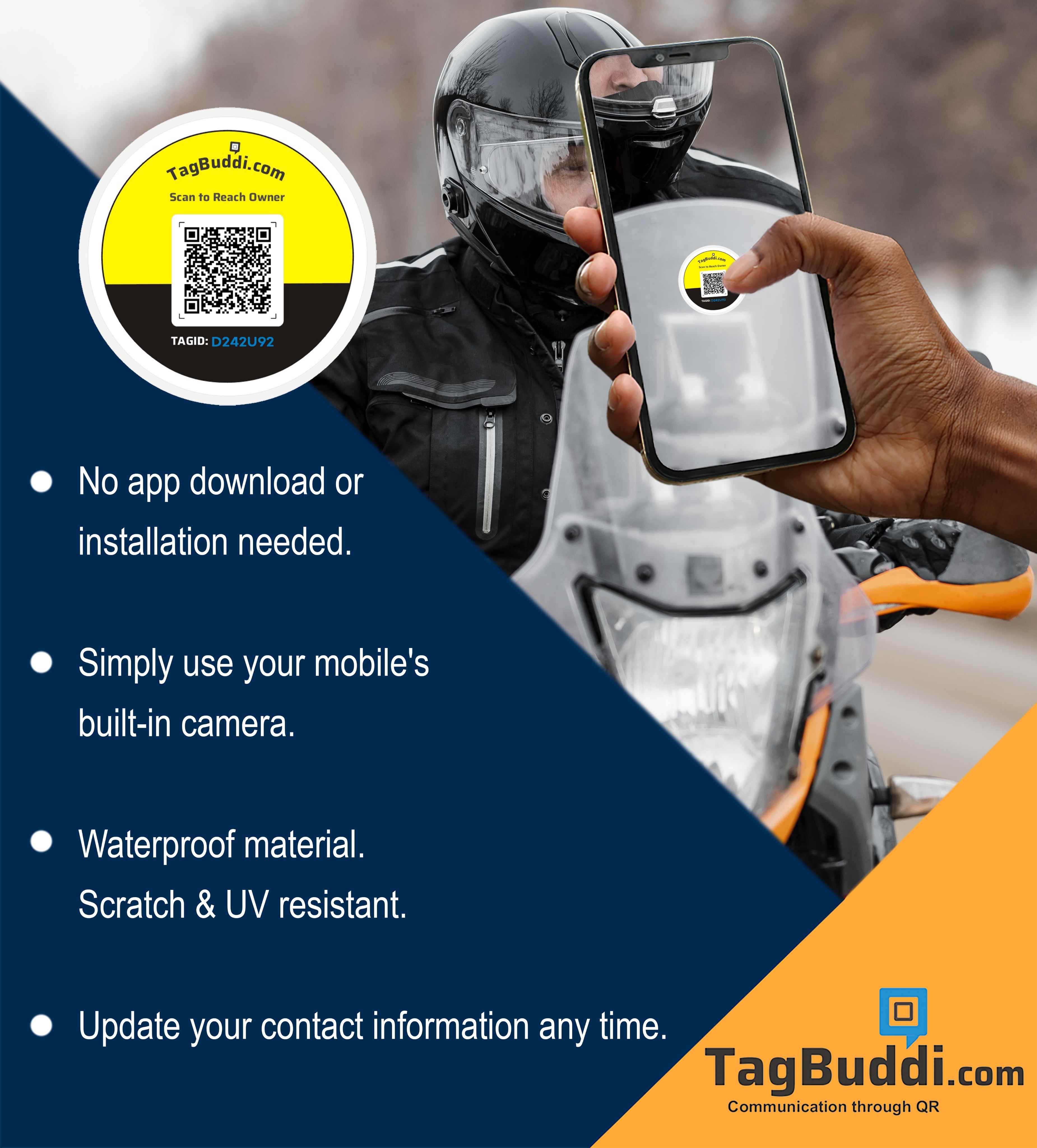 Attach the TagBuddi QR tag to your two-wheeler. If someone finds it parked wrongly, unattended, or at risk, they can scan the QR and reach you instantly. Finders can message you only after verifying their phone number via OTP — keeping communication safe and secure.