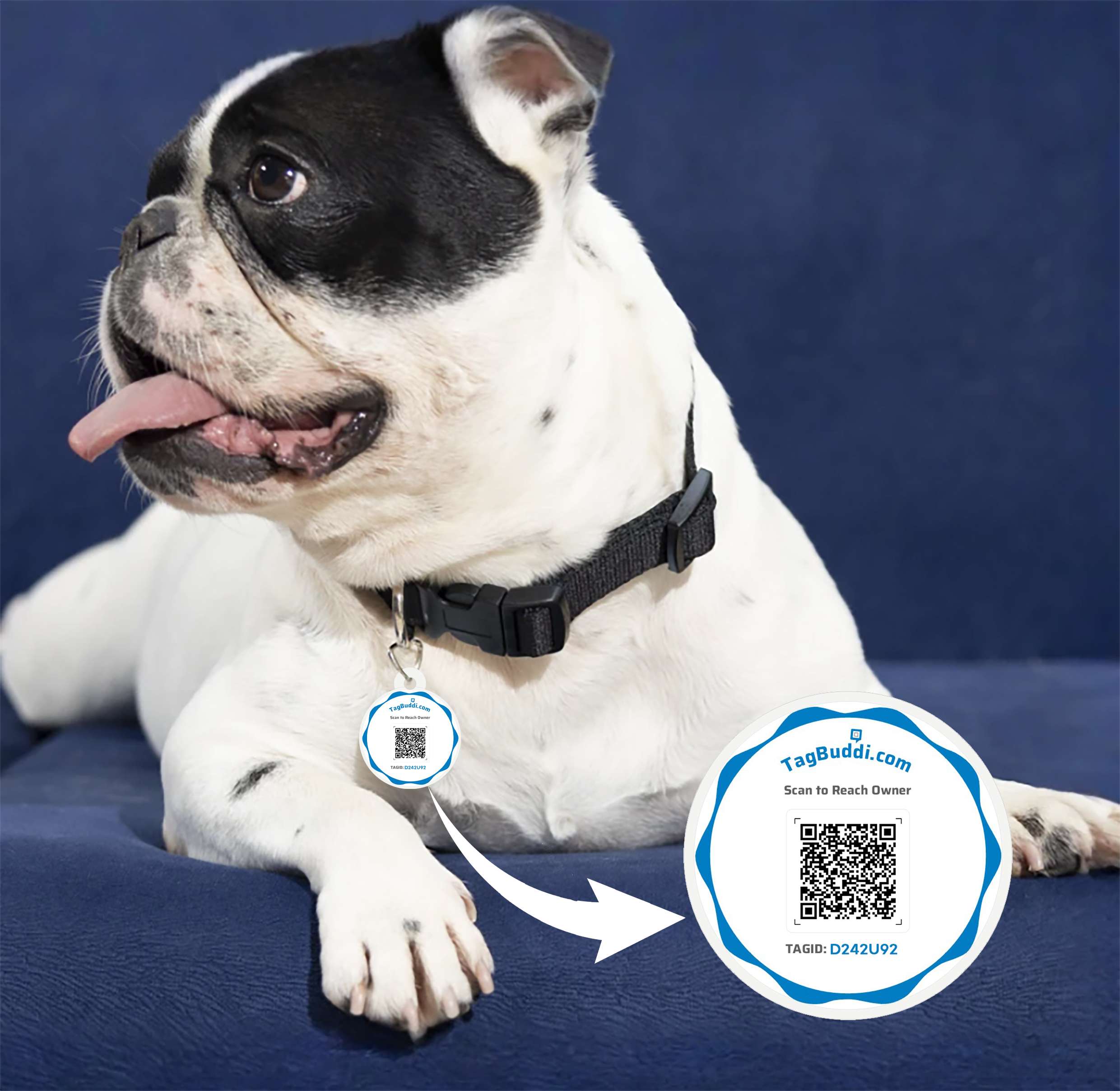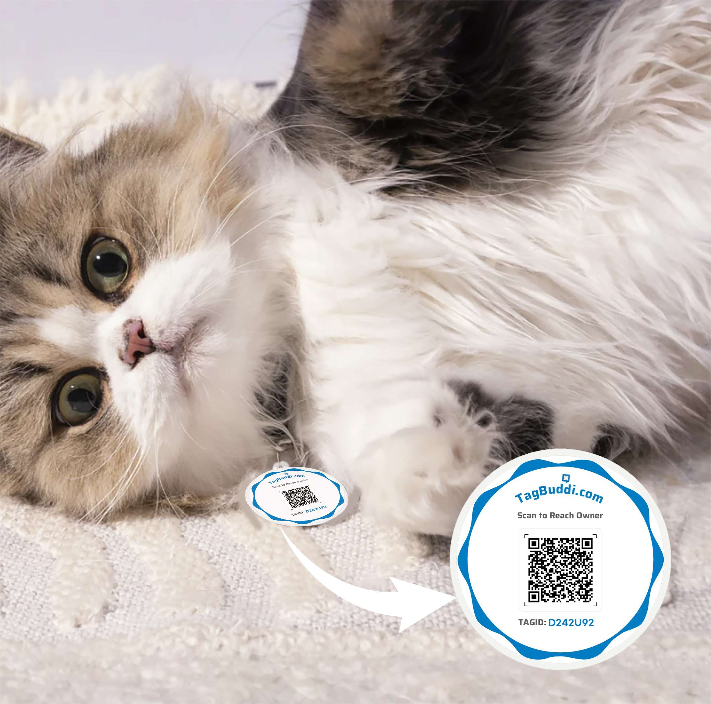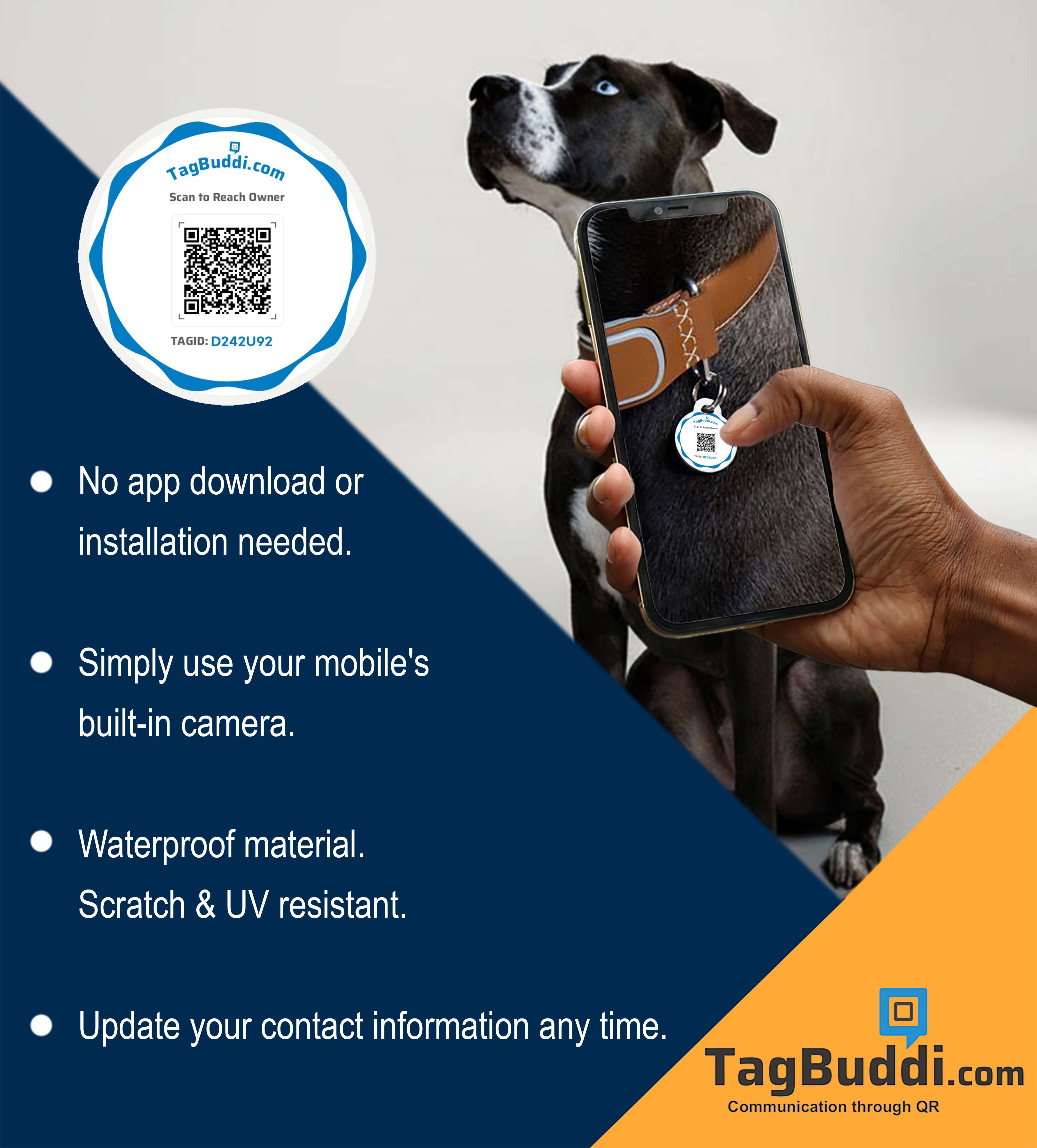 Attach the TagBuddi QR tag to your pet’s collar. If someone finds your lost or wandering pet, they can scan the QR and reach you instantly. Finders can contact you only after verifying their phone number via OTP — ensuring safe and trusted communication.