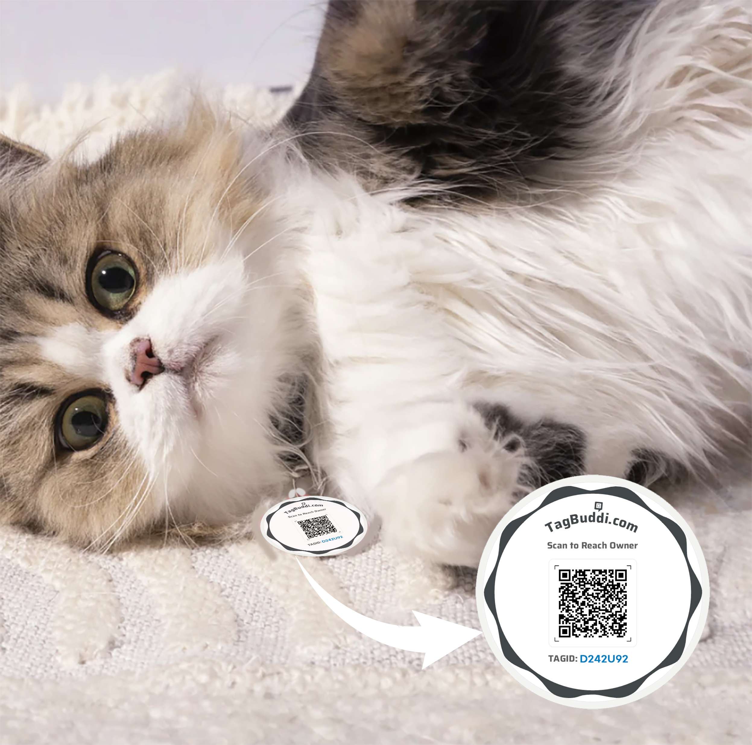 Attach the TagBuddi QR tag to your pet’s collar. If someone finds your lost or wandering pet, they can scan the QR and reach you instantly. Finders can contact you only after verifying their phone number via OTP — ensuring safe and trusted communication.