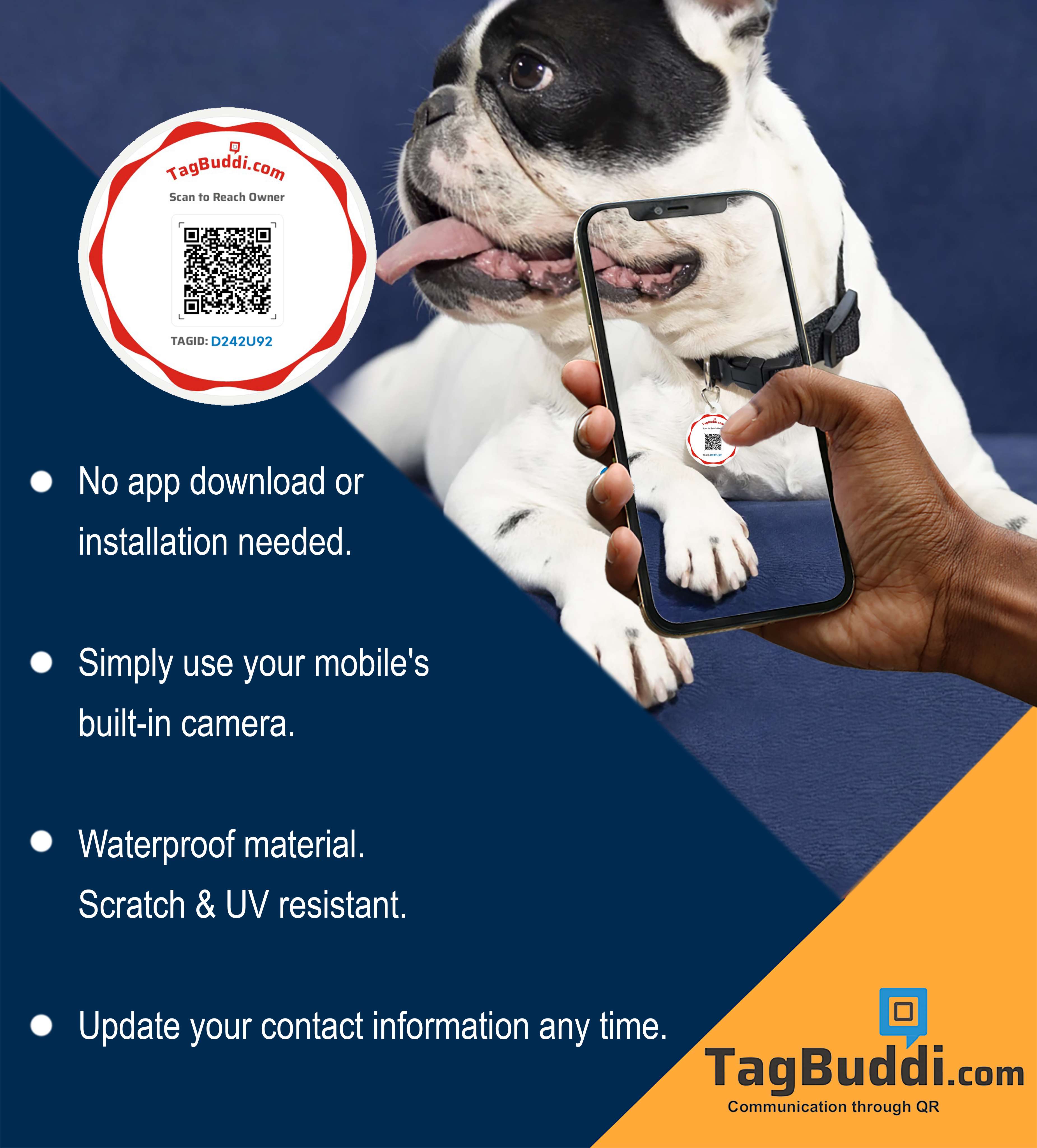 Attach the TagBuddi QR tag to your pet’s collar. If someone finds your lost or wandering pet, they can scan the QR and reach you instantly. Finders can contact you only after verifying their phone number via OTP — ensuring safe and trusted communication.